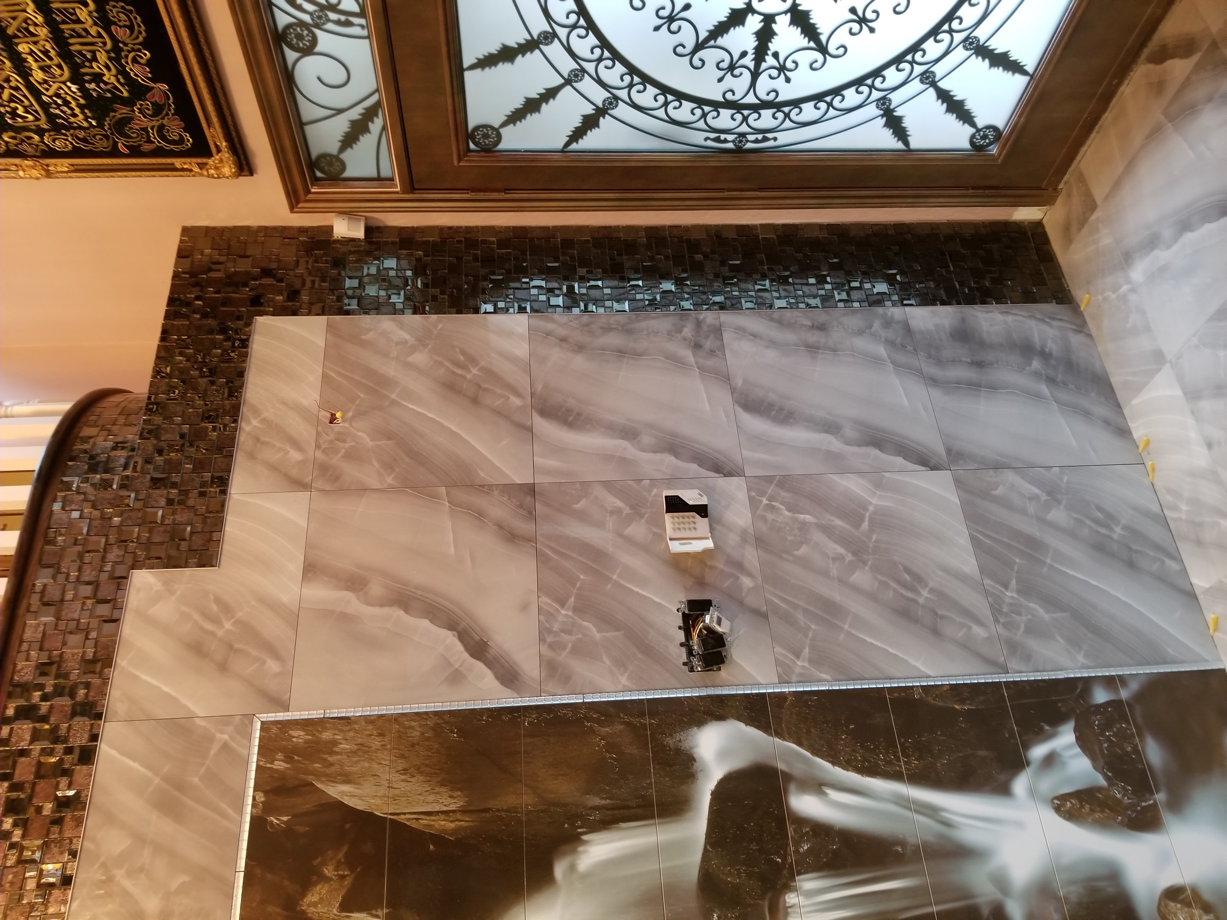 This project transformed a traditional hallway into a statement luxury entrance. Custom waterfall-effect porcelain panels were installed as feature walls, framed with marble and highlighted with shimmering mosaic details. The design flows seamlessly from the entrance to the staircase, creating a striking first impression with both natural and modern aesthetics.